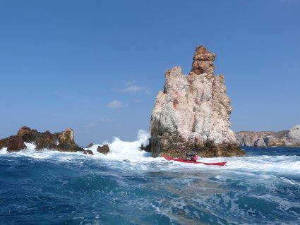 In der ersten Woche war es sehr heiß, trotz Windstärken zwischen 4 bis 5. Da die Kajakfahrten extra auf der Leeseite der Insel stattfanden, konnten sie unter relativ ruhigen Verhältnisse durchgeführt werden. Dies gab uns die Gelegenheit die diversen Höhlen und Gesteinsformationen entlang der sehr schönen aber recht kargen Küste kennenzulernen. Die Fahrten waren super organisiert, wenn auch manchmal ein bisschen überbesucht. Es wurden meistens Strecken zwischen 12 – 15 km gefahren und es gab immer zwei Pausen (eine kürzere und eine längere Mittagspause von ca. zwei Stunden), in denen wir das vom Fahrtenleiter mitgebrachte Picknick verschlangen. Die Fahrten gingen meistens um ca. 11:00 Uhr an der Einsatzstelle los und wir waren in der Regel gegen 16:30 Uhr an der Einsatz-/Aussatzstelle wieder zurück, sodass immer genügend Zeit für Ausflüge und andere Aktivitäten abends überblieb.